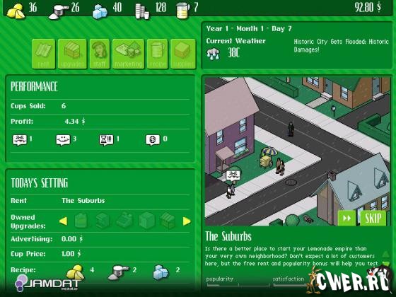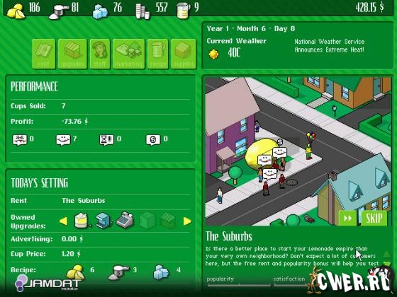 Ваша задача: смешать их в правильных пропорциях, чтобы покупатели не выплёвывали его после первого глотка, понижая тем самым вашу популярность и загрязняя окружающую среду. Пока вы не изобретёте удобоваримый рецепт, чтобы развернуться по всему городу со своим лимонадным бизнесом, можно потренироваться на ближних своих, а именно на соседях, поставив лоток возле своего дома. Вам не придётся платить ренту за землю, а в случае неудачи всегда можно спрятаться в доме от разозлённых клиентов.