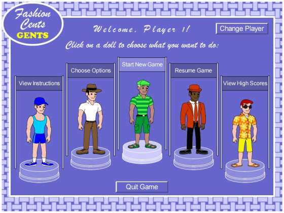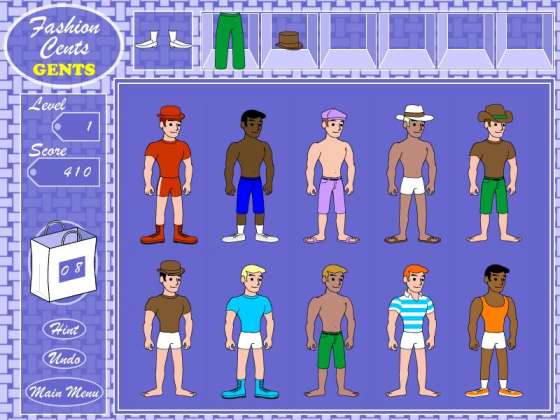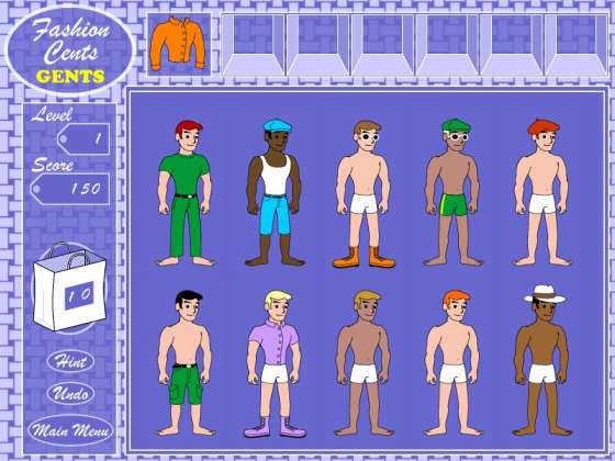 Fashion Cents Gents оригинальная игра, где Вам предоставляют широкий ассортимент головных уборов, одежды, и обуви разных стилей и цветов, которые Вы должны правильно подбирать для клиентов. Очки и кошельки дают бонусы. Полки наверху экрана обеспечивают хранение для одежды, которую Вы не можете использовать. Удачи!