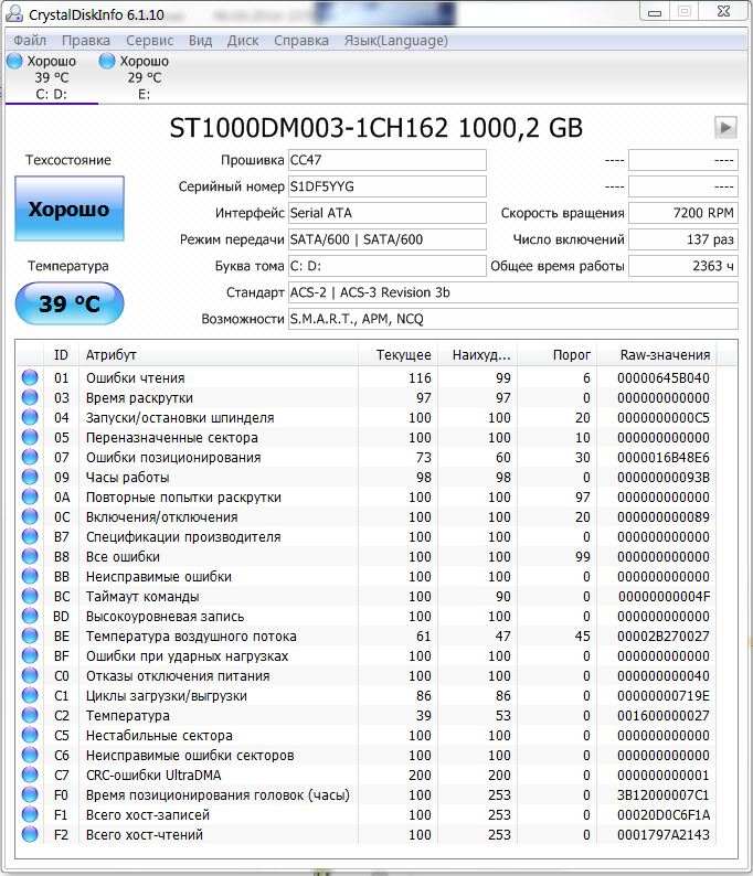 CrystalDiskInfo следит за «здоровьем» жестких дисков, поддерживающих технологию самодиагностики S.M.A.R.T. Осуществляет мониторинг и дает общую оценку состояния вашего диска. Также выдаёт подробную информацию о жестких дисках, установленных в компьютере (прошивка, серийный номер, стандарт, интерфейс, общее время работы и др.) и выводит параметры атрибутов S.M.A.R.T. (ошибки чтения, производительность, запуски/остановки шпинделя, время поиска дорожки, количество циклов включения-выключения, ошибки секторов и многое другое). Может выводить в трее индикаторы с температурой каждого накопителя, строит график изменения температур. Позволяет управлять настройками производительность/шум.