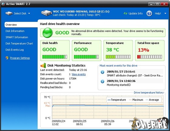 Active Smart - превосходный иструмент для диагностики дисков и надёжной защиты жесткого диска от внезапного сбоя. Сбой диска, как правило, случается совершенно внезапно, когда к нему не готовы. Установив данную программу вы сможете защититься от возможной потери данных в случае сбоя жесткого диска. Программой используется S.M.A.R.T. технология для контроля состояния жесткого диска. Её основная задача - непрерывный контроль и предупреждение о любой проблеме с диском до того, как возникнет опасность потери данных. Active SMART поддерживает проверку дисков автоматически при загрузке системы, позволяет непрерывно отслеживать состояние дисков с интервалом от 1 минуты до 99 часов или производить быструю диагностику дисков для экономии ресурсов слабых компьютеров. Программа предупредит пользователя, если температура диска превысит заданную. Для извещения пользователя, программой поддерживаются всплывающие сообщения, e-mail и сетевые сообщения, чтобы сообщить о любой проблеме с дисками.