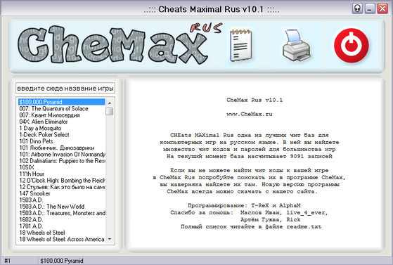 CheMax - наибольшая русскоязычная база с чит кодами для компьютерных игр. Простой и красивый интерфейс, малый размер, и при этом огромное количество представленных игр.