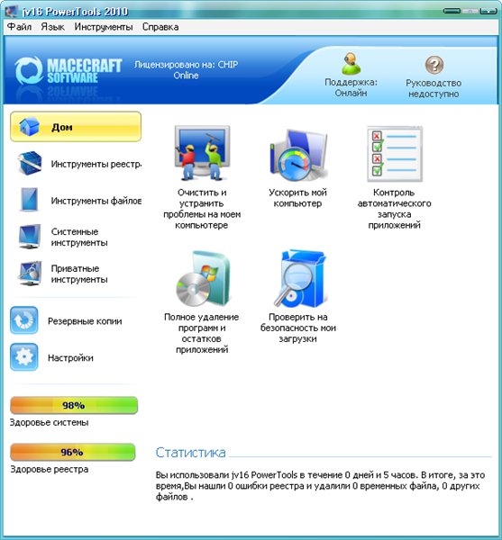 jv16 PowerTools 2012 - разработка, представляющая собой набор утилит для комплексной работы с реестром (очистка, правка, автозагрузка, установка/удаление, мониторинг системного реестра, поиск - замена), с файлами (поиск дубликатов, органайзер файлов), умеющая очищать диски и управлять компьютерами в локальной сети.