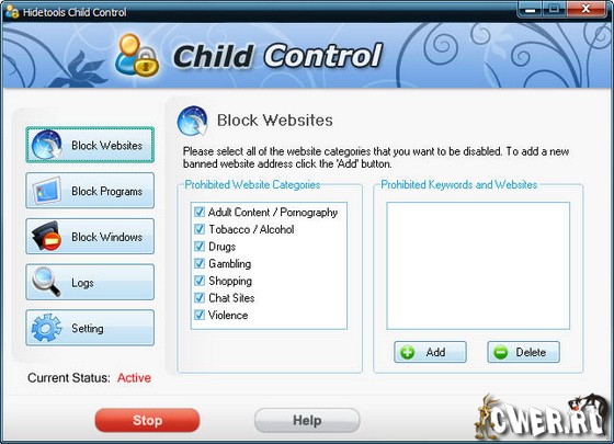 Child Control - программа ограничивает время, проводимое вашими детьми за компьютером, как только выделенное им время закончится, компьютер автоматически выключится и повторный вход будет возможен только после ввода пароля. Ограничение можно ввести как по общему времени (например, не более 1 часа в день), так и по периоду времени, когда можно работать (например, с 22:00 до 8:00 доступ запрещен). Кроме этого, программа позволяет запретить посещение нежелательных сайтов, а также заблокировать доступ к определенным дискам и папкам. Можно установить блокировку запуска тех или иных программ и внесение изменений в системный реестр. Программа ведет лог-файл всех событий.
